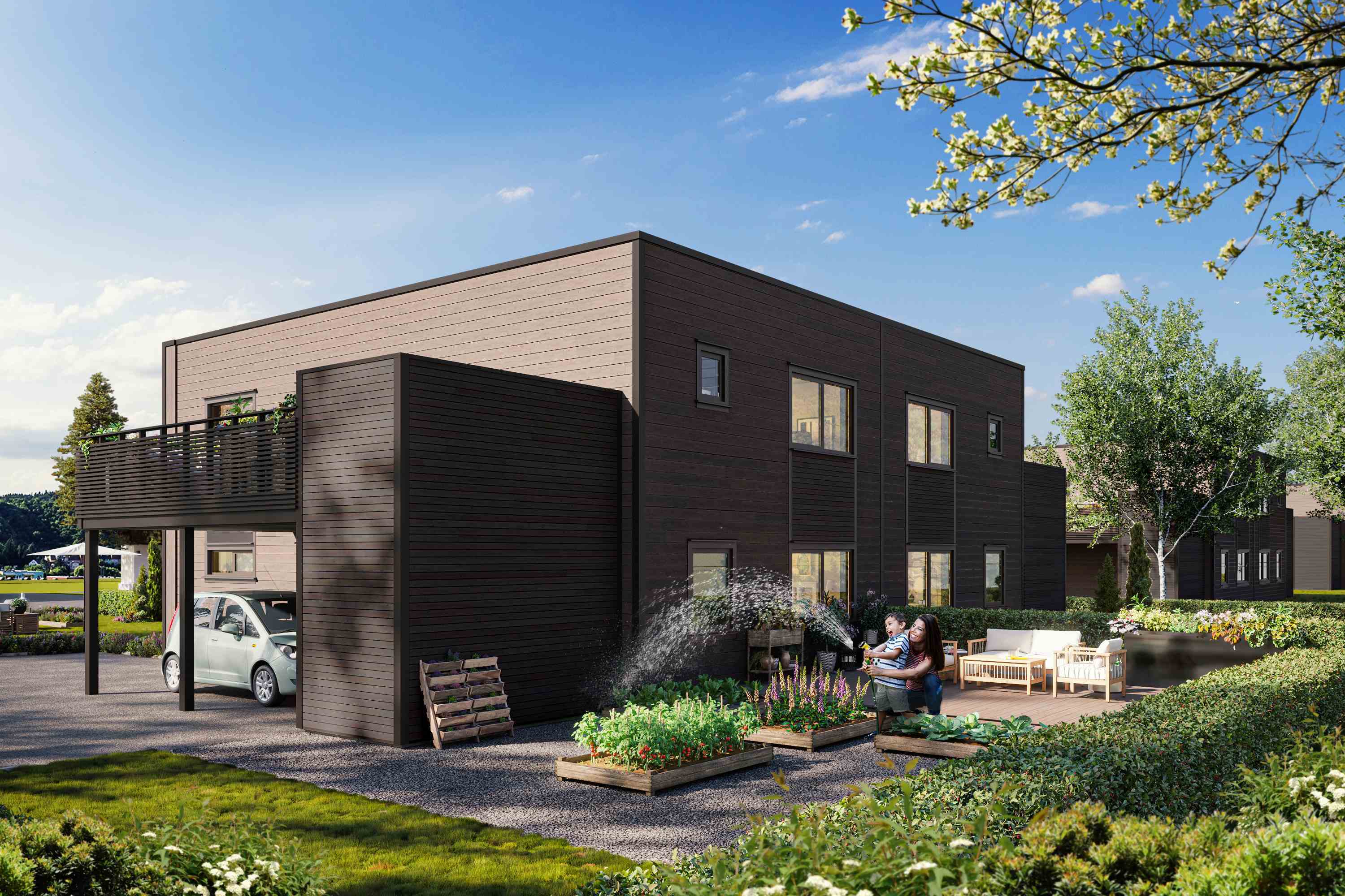 Bjørk er en romslig tomannsbolig designet for den moderne familien. Den går over to plan, og er beregnet for flat tomt. Bjørk har en stor carport til hver enhet, som i tillegg til å ha god lagringsplass også skaper en inviterende og godt skjermet inngang til hjemmet ditt.